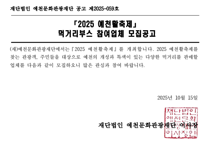 2025 예천활축제 먹거리부스 참여업체 모집공고