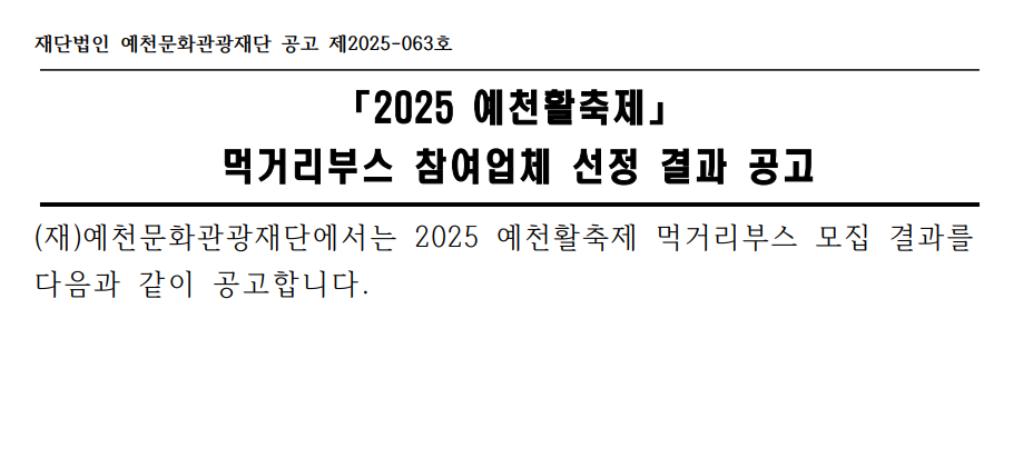 2025 예천활축제 먹거리부스 참여업체 선정 결과 공고