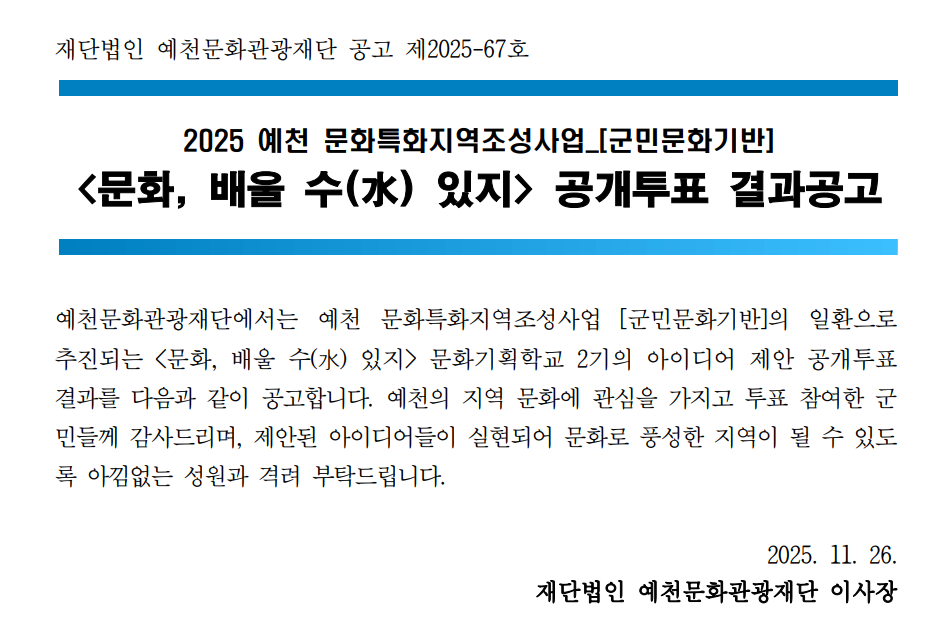 2025 <문화、배울 수 있지> 2기 아이디어 제안 공개투표 결과공고