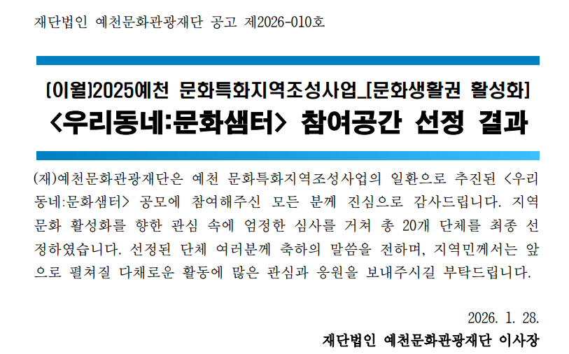 2026 <우리동네:문화샘터> 참여공간 선정 결과 공고