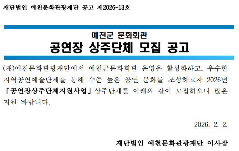 2026 예천군문화회관 공연장 상주단체 모집 공고