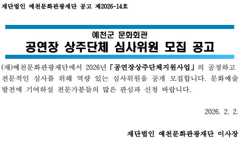 2026 예천군문화회관 공연장 상주단체 심사위원 모집 공고