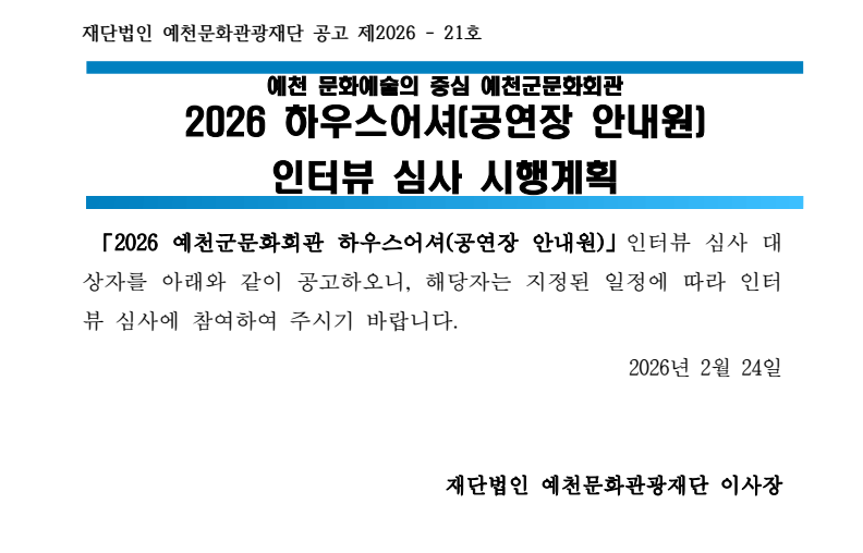 [공고문] 2026 예천군문화회관 하우스어셔(공연장 안내원) 인터뷰 심사 시행계획.pdf