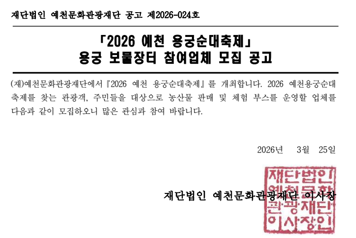 2026 예천 용궁순대축제 용궁 보물장터 참여업체 모집 공고
