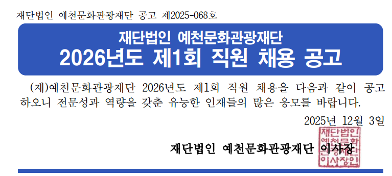 [2025-068] 2026년도 제1회 직원 채용 공고