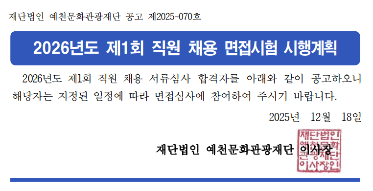 [2025-070] 2026년도 제1회 직원 채용 면접시험 시행계획