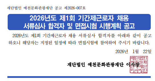 [2026-007] 2026년도 제1회 기간제근로자 채용 서류심사 합격자 및 면접시험 시행계획