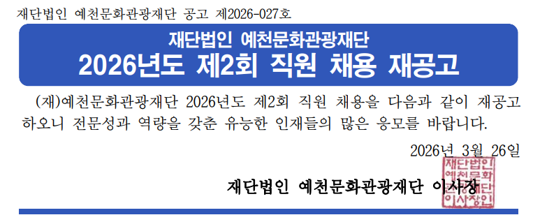 [2026-027] 2026년도 제2회 직원 채용 재공고